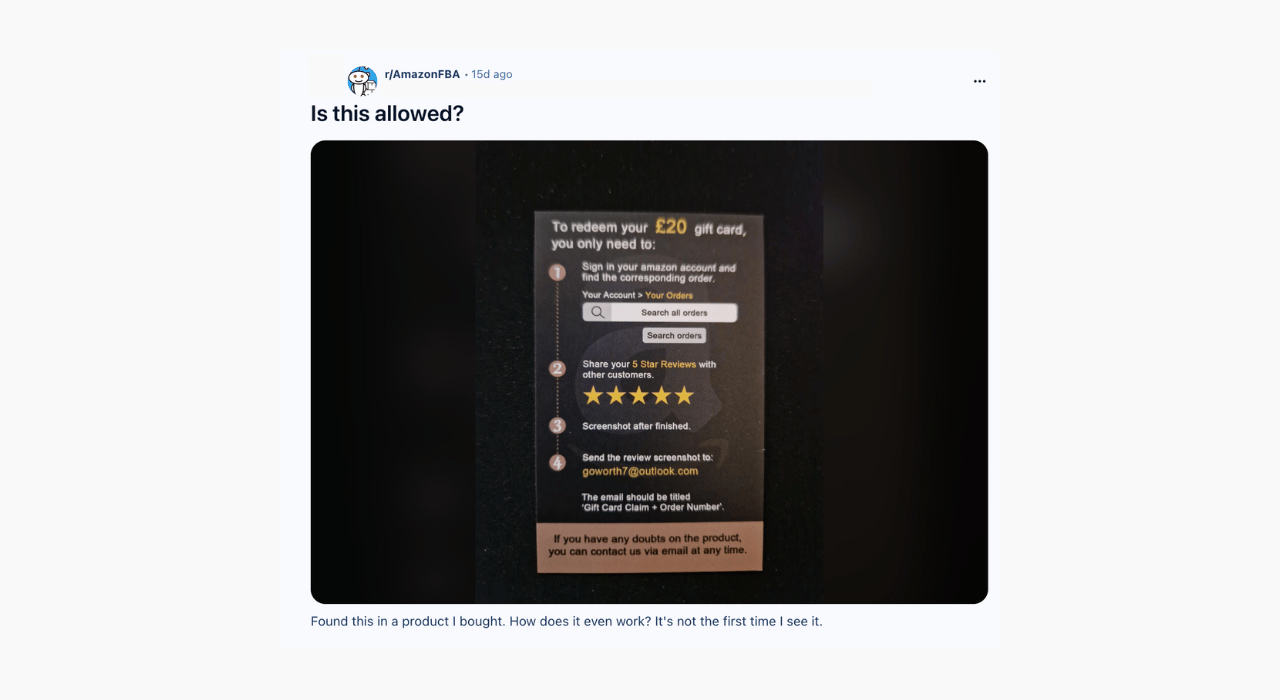 An Amazon seller (OP) asked: “Is this allowed?” after receiving a product insert that promised a £20 (over $26) gift card in exchange for a five-star review.